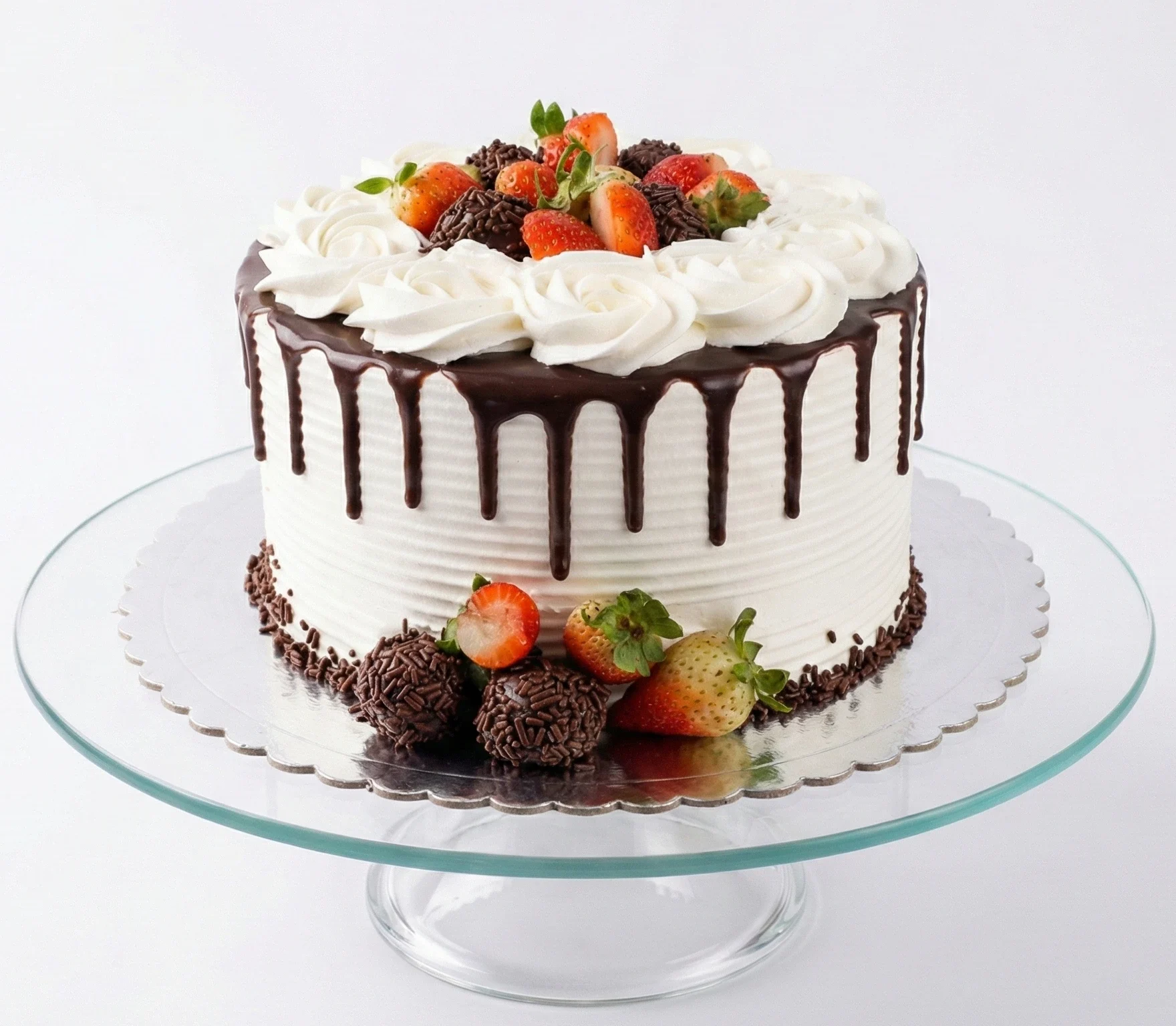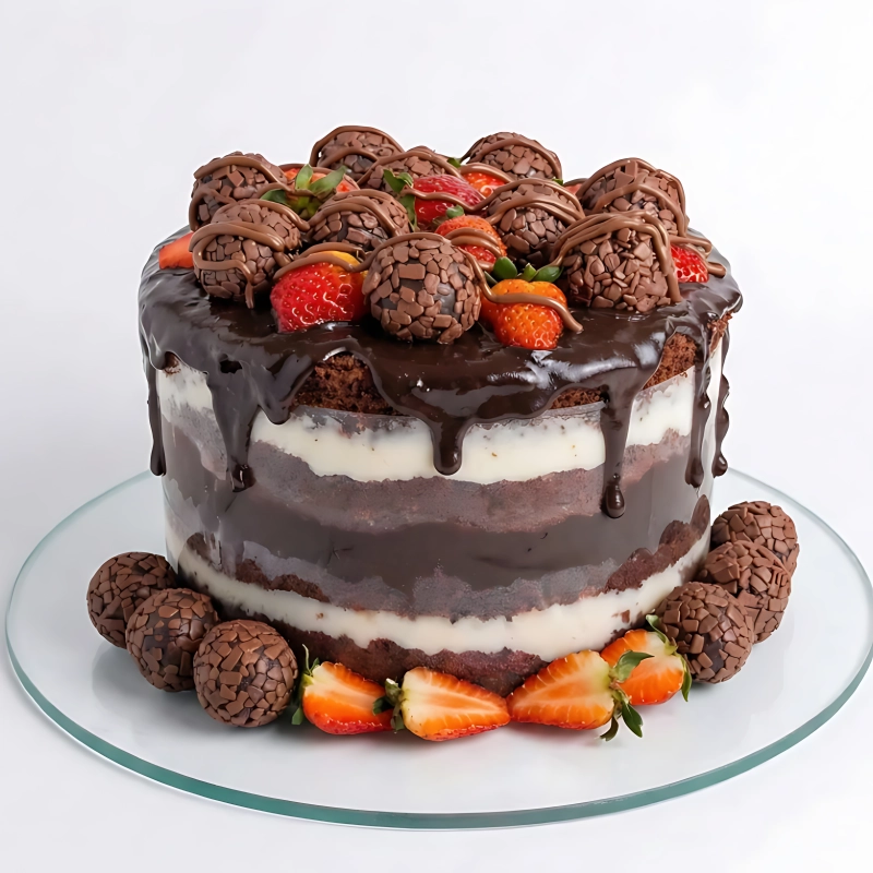 Bolo de camadas aparentes, recheio generoso e acabamento natural. Sabor real, textura artesanal e visual clean para qualquer celebração